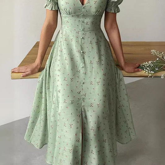women's spring and summer new elegant buttoned mid-length skirt V-neck lantern sleeve printed dressRegular price $34.99 USDRegular priceUnit price / per$34.99 USDSale price $34.99 USD