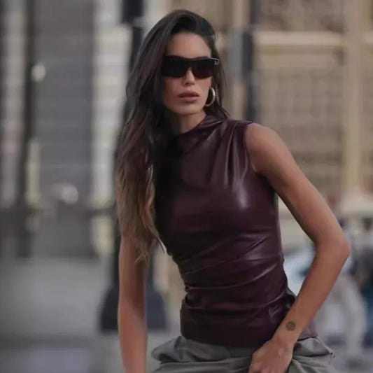 SC005 Amazon European Style Women's Leather Halter Top 2024 New Waist-Fitted Crossbody Sleeveless Top Women's Polyester Clothing