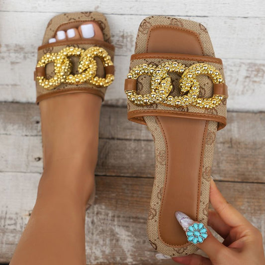 Women Metal Decor Single Band Flat Sandals Fashion Sexy Open Toe Outdoors Slides Luxurious Office Ladies Party Female Shoes