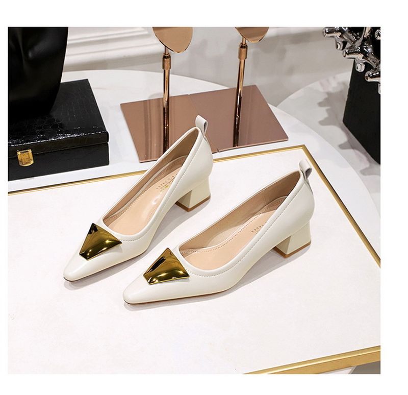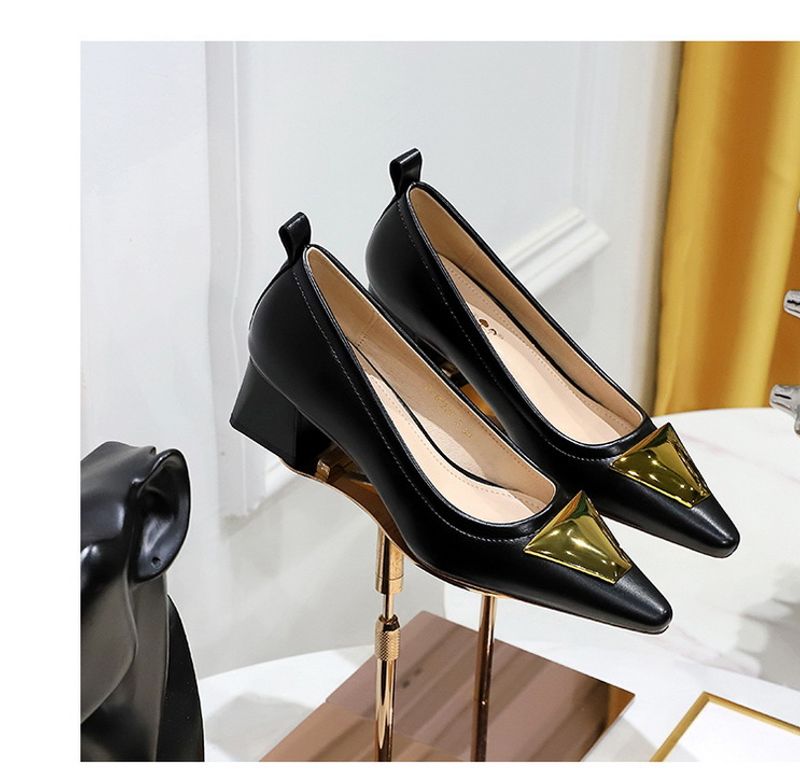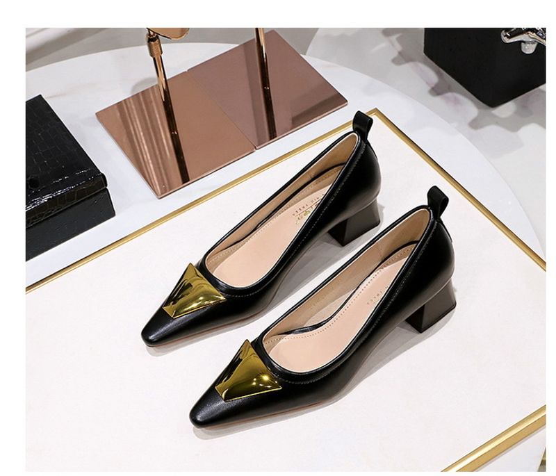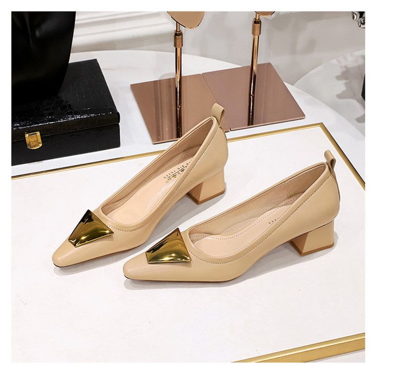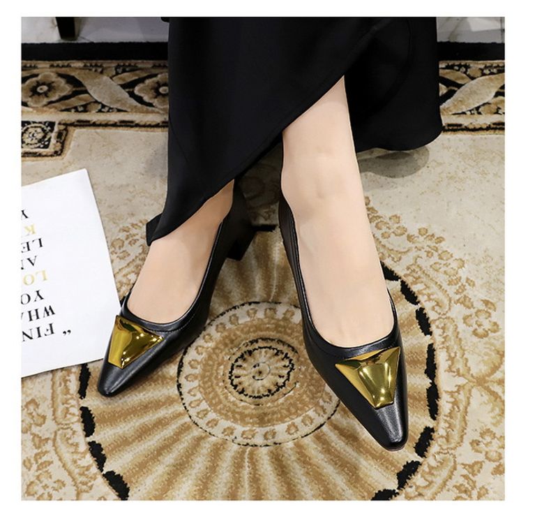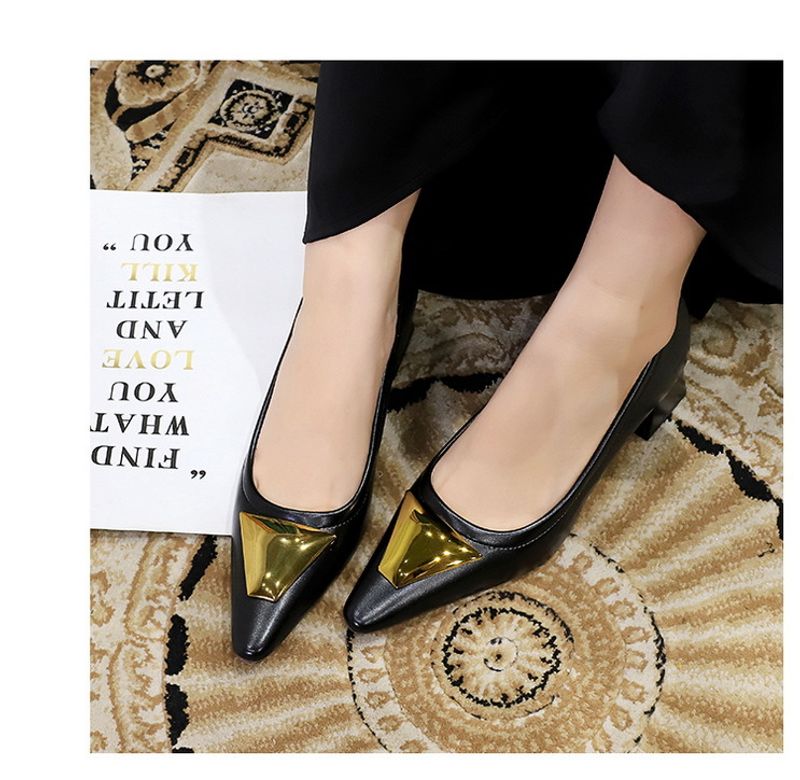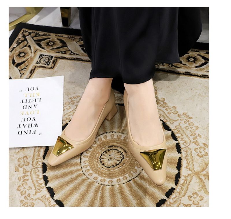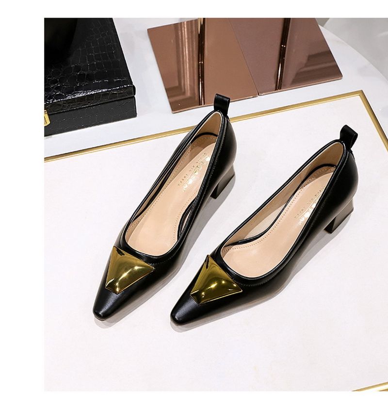 1235-K55 Fashion Coarse Middle Heel Shallow Mouth Pointed Metal Decorative Single Professional OL Commuter Women's Shoes