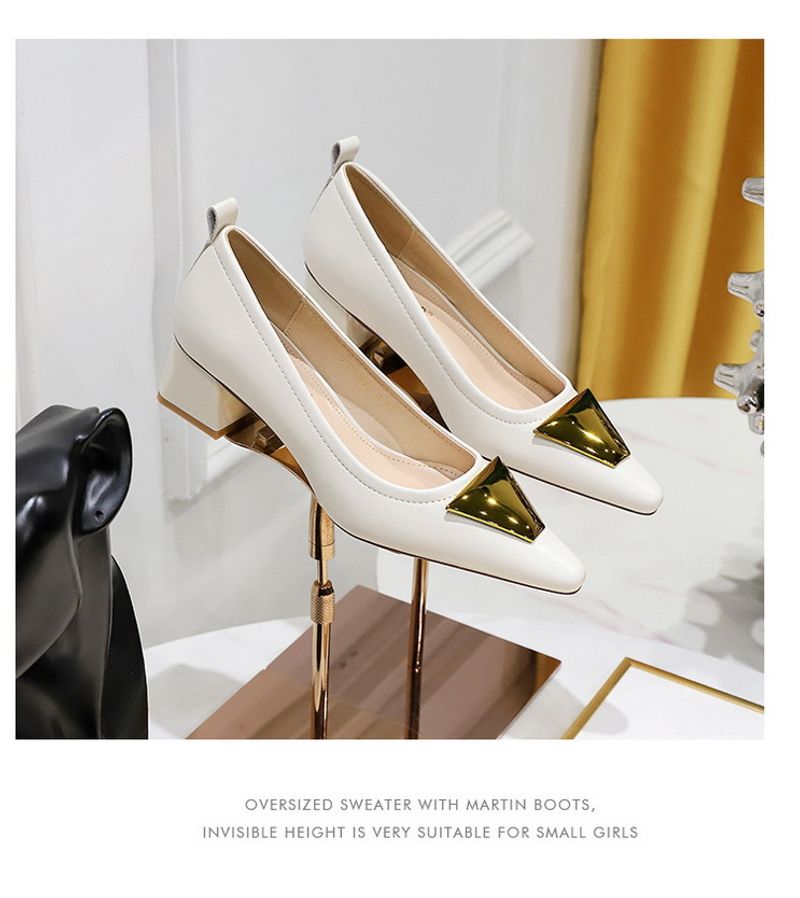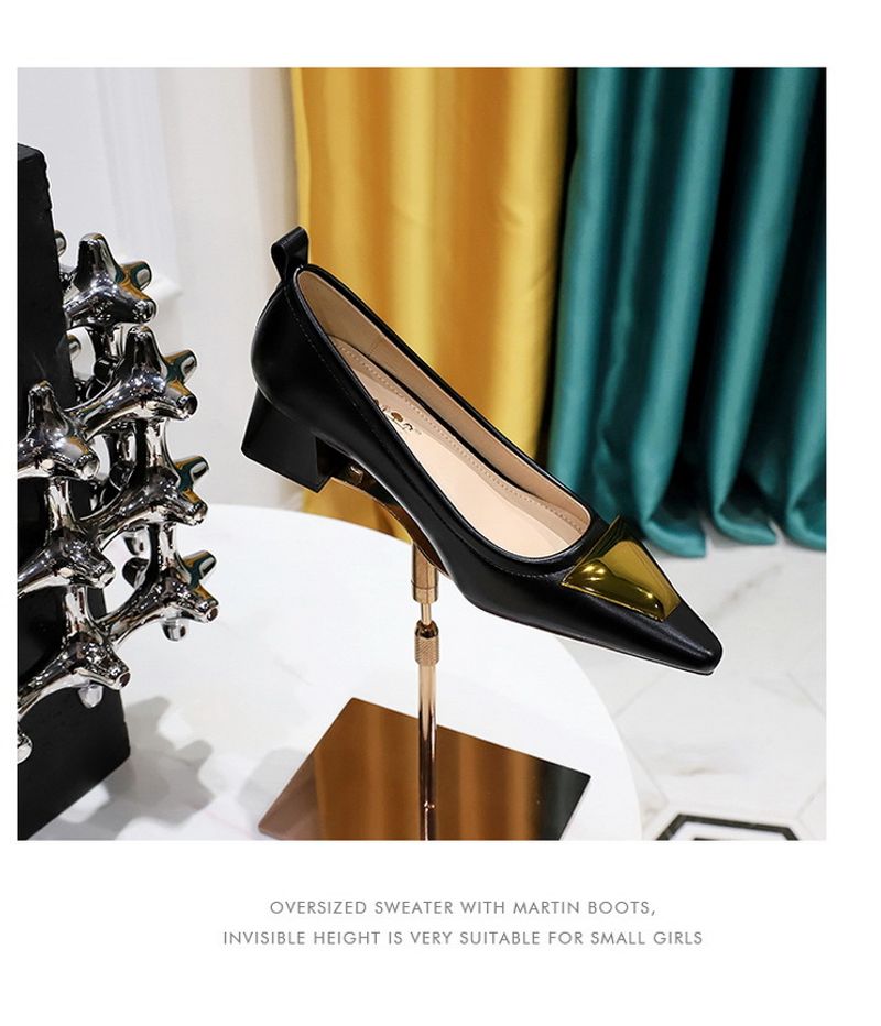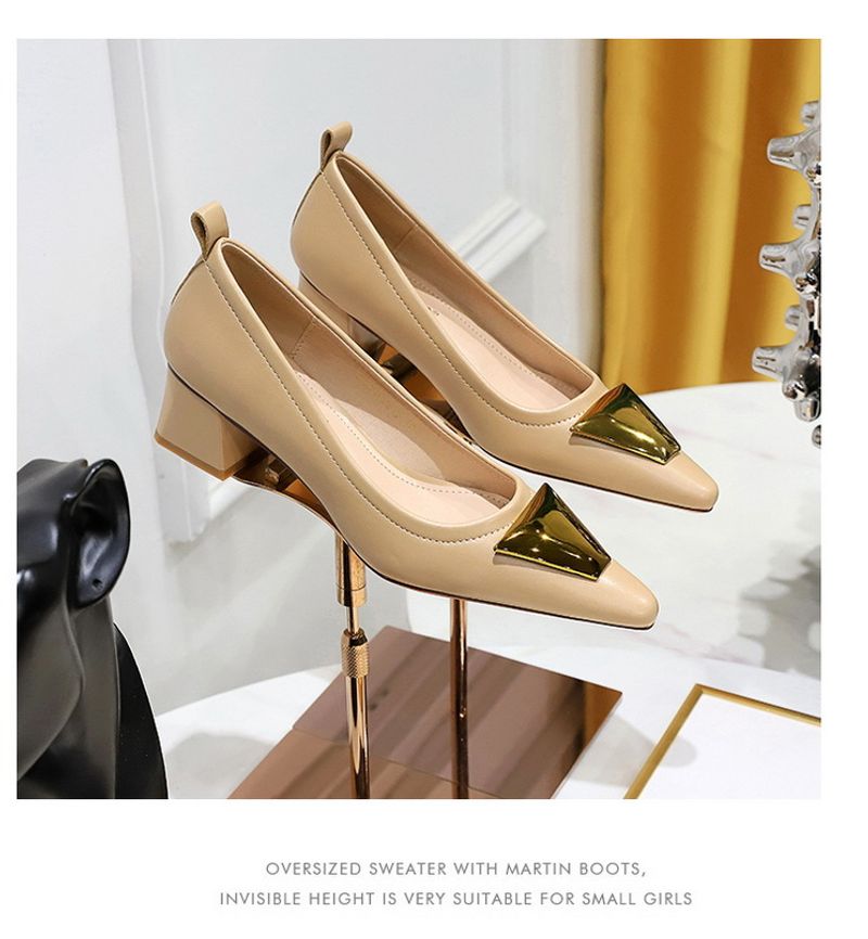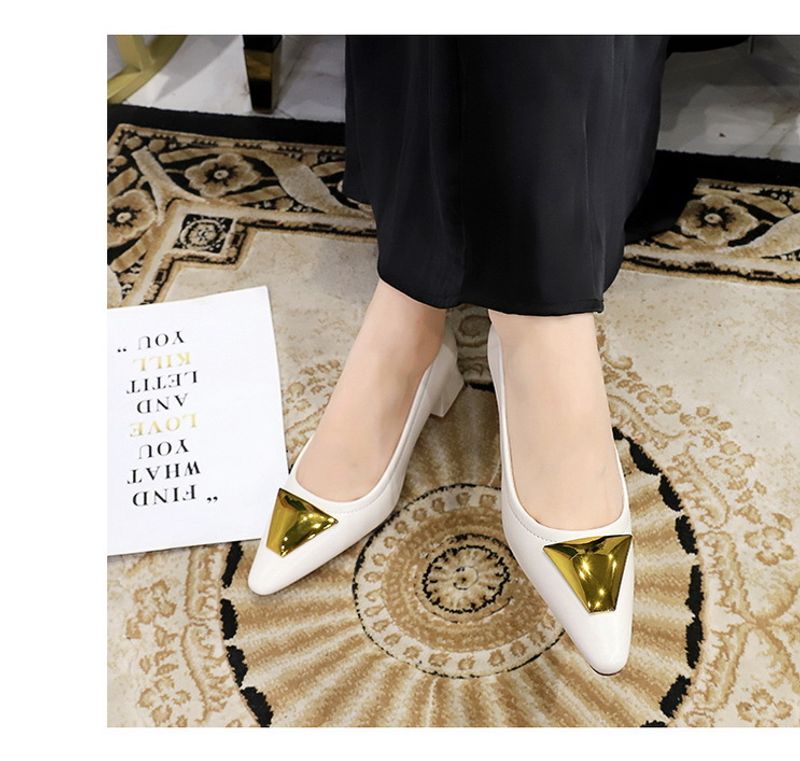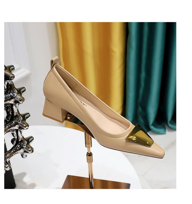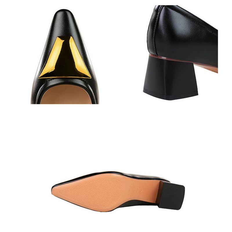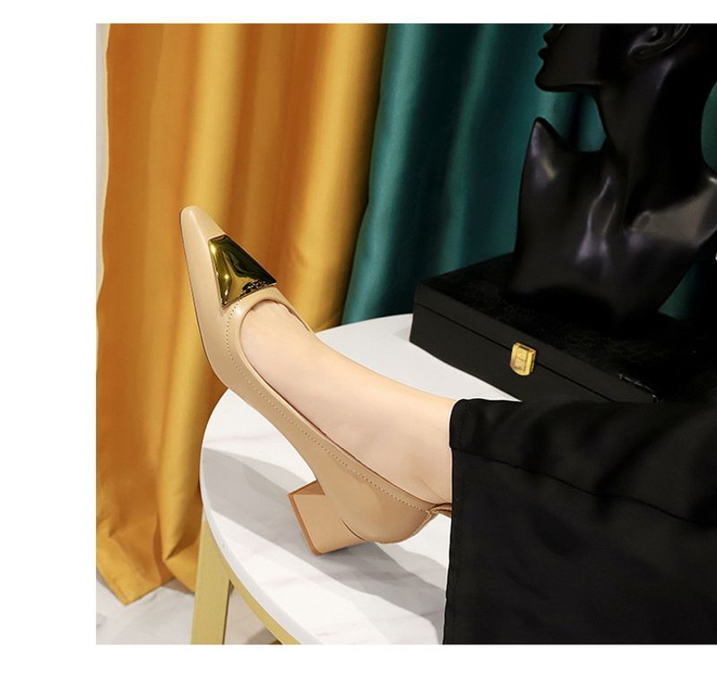 1235-K55 Fashion Coarse Middle Heel Shallow Mouth Pointed Metal Decorative Single Professional OL Commuter Women's Shoes