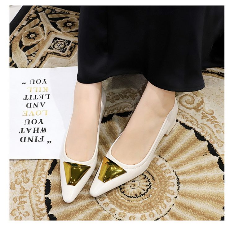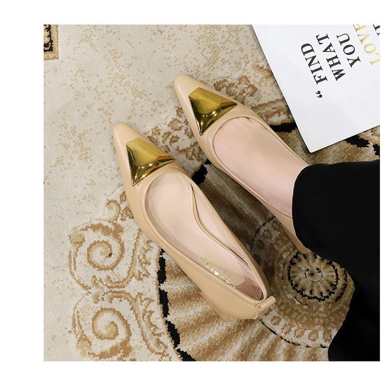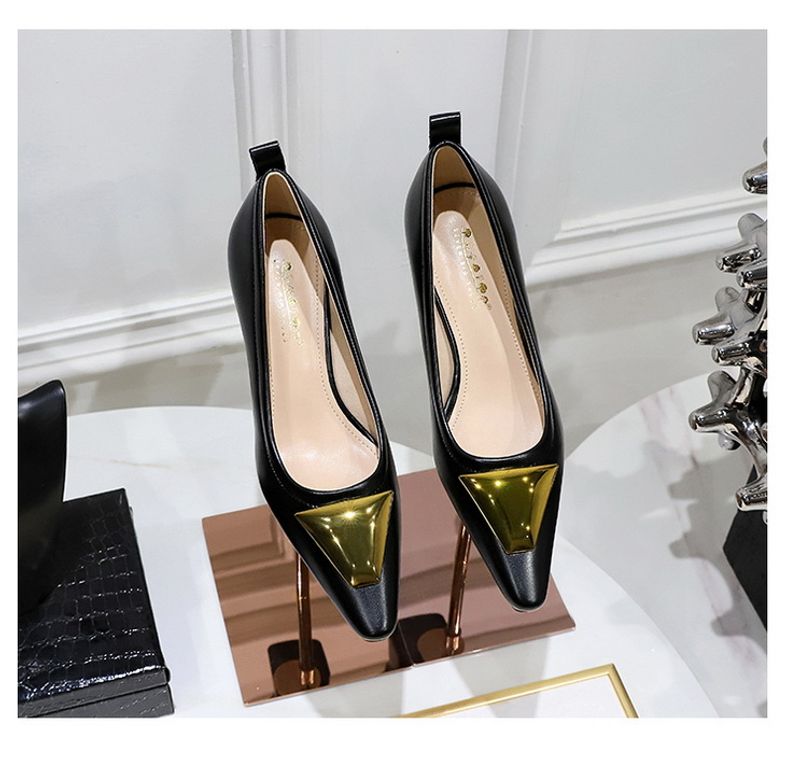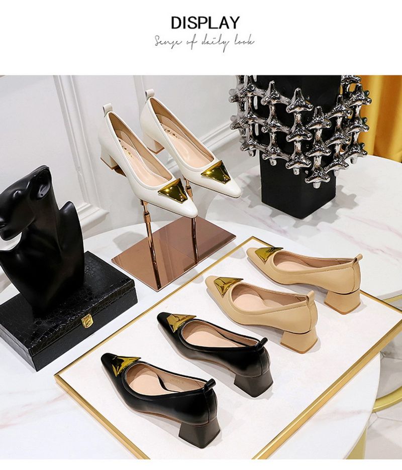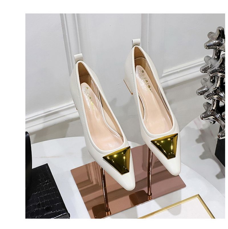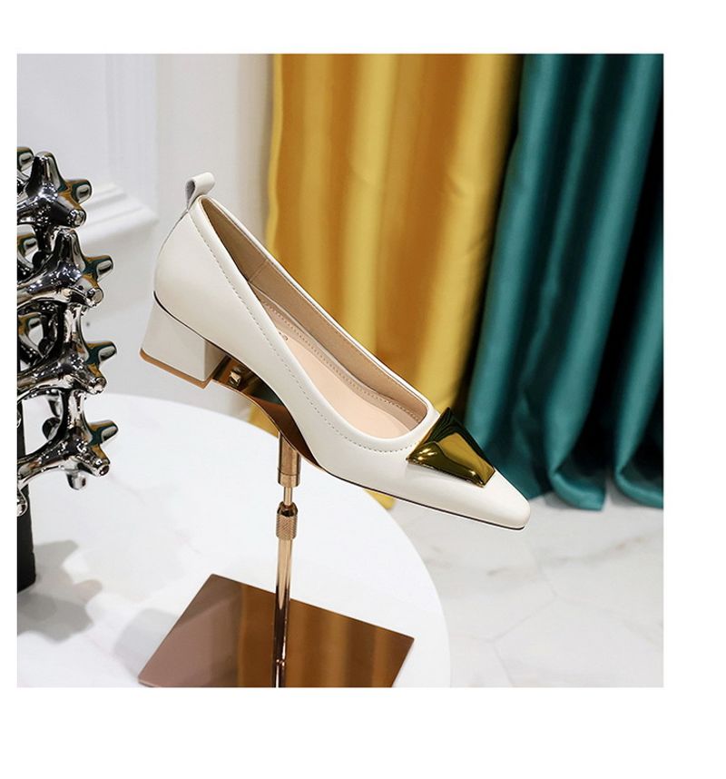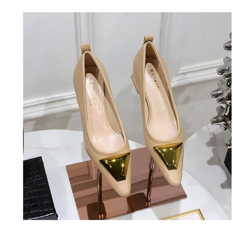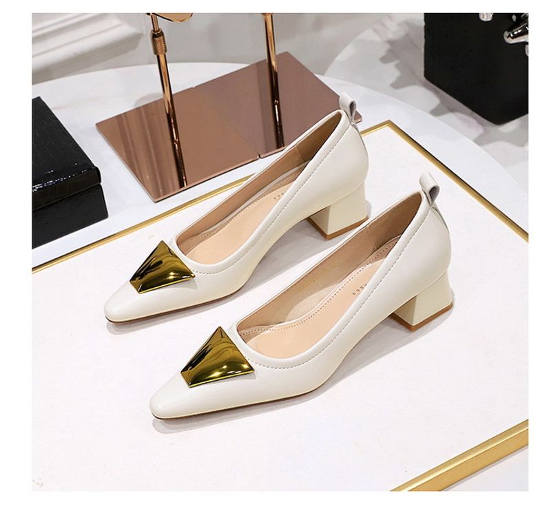 1235-K55 Fashion Coarse Middle Heel Shallow Mouth Pointed Metal Decorative Single Professional OL Commuter Women's Shoes