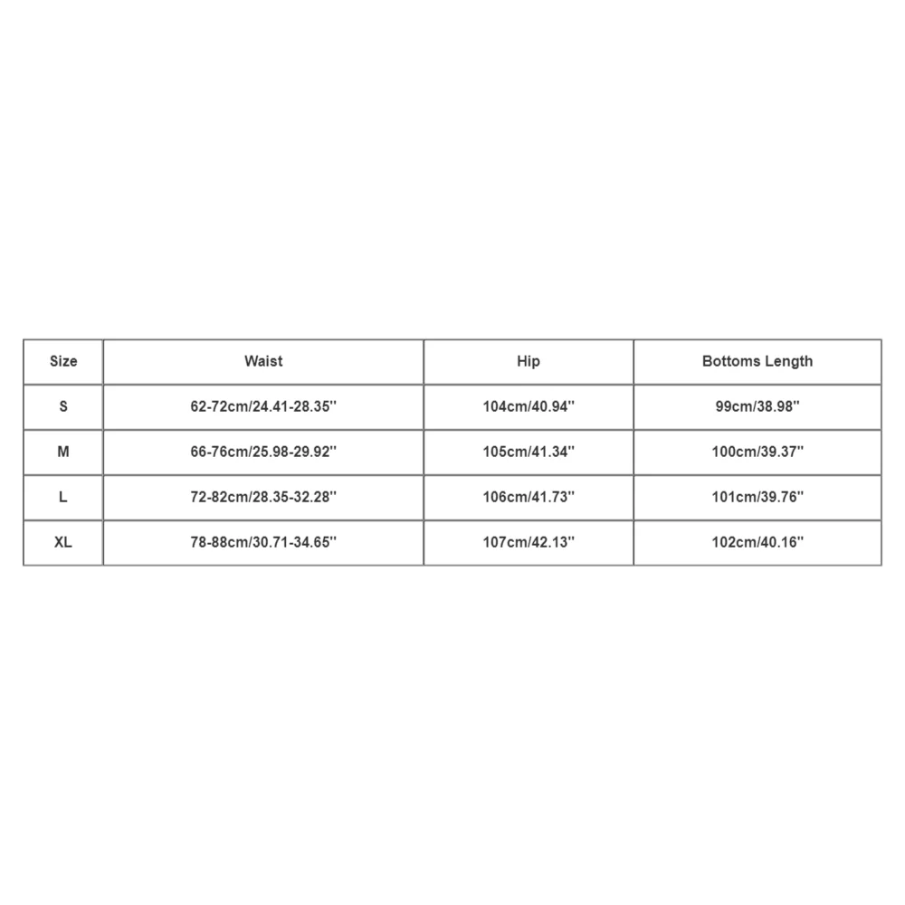 | Size:S | Waist:62-72cm/24.41-28.35'' | Hip:104cm/40.94'' | Bottoms Length:99cm/38.98'' |