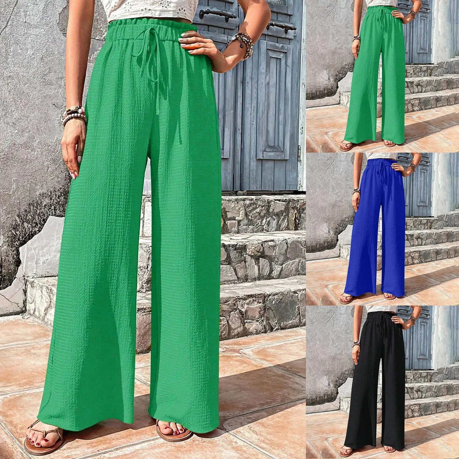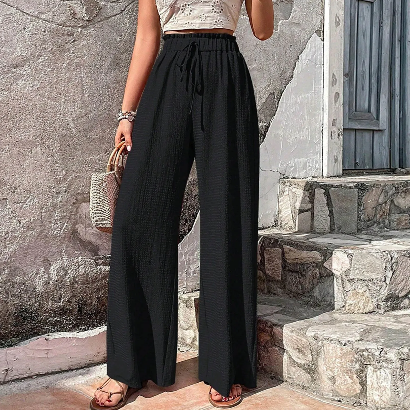 2024 New Summer Wide Leg Pants For Women Drawstring High Waist Trousers Loose Fit Palazzo Pants Casual Solid Color Pantalones