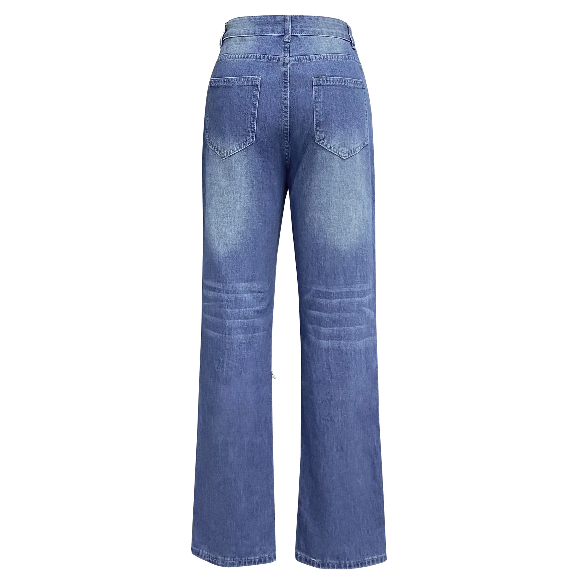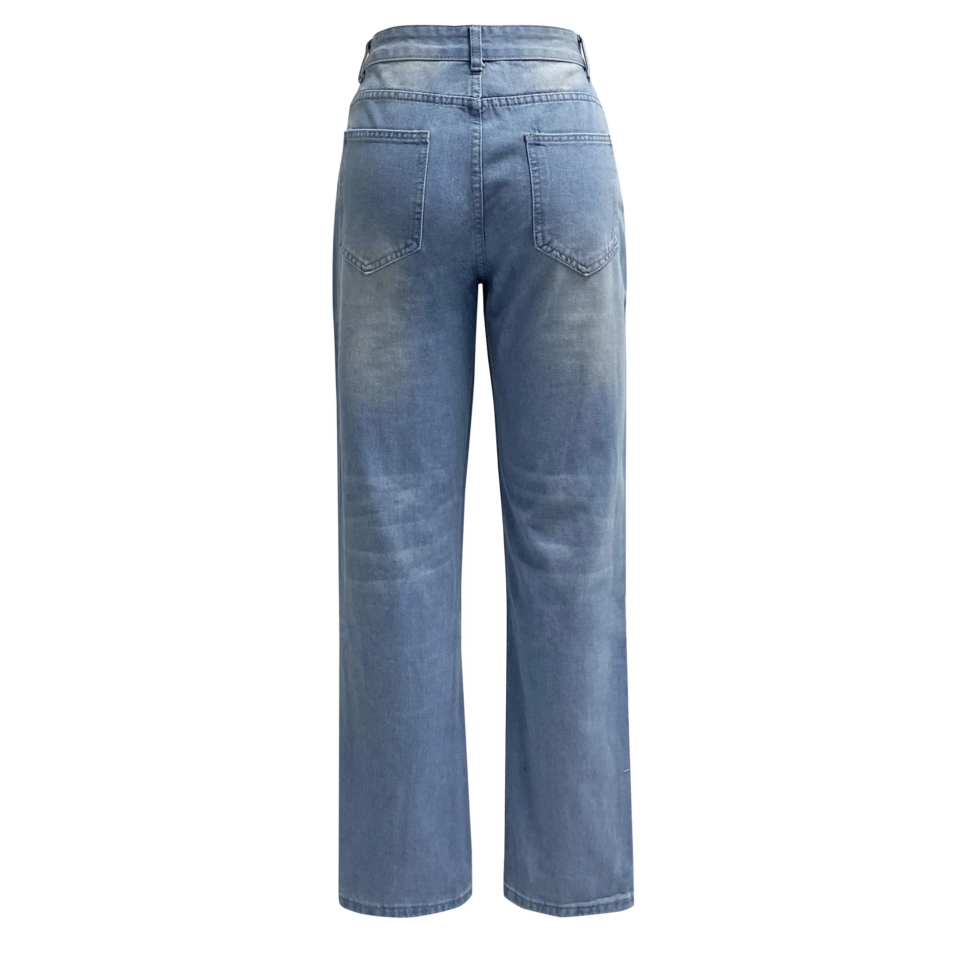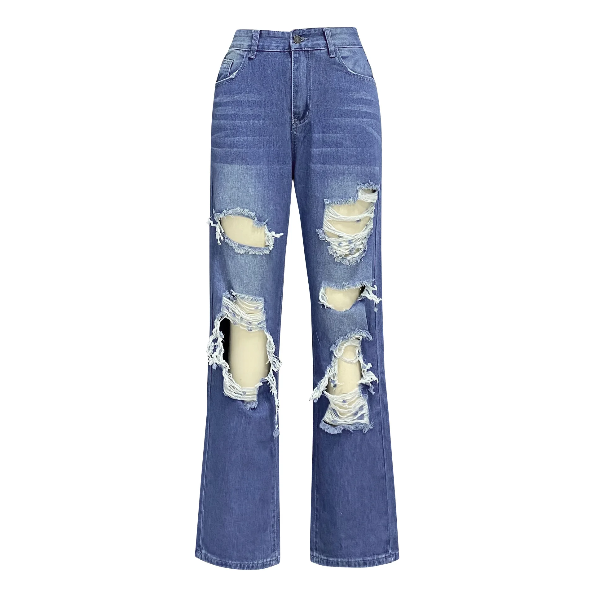 American Straight Tube Ripped High-waisted Jeans, Women's Spring/Summer New Loose Personality Ripped Long Jeans,Street Hipster
