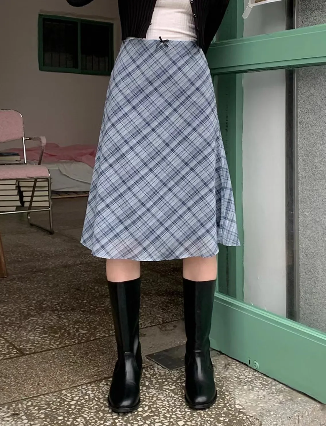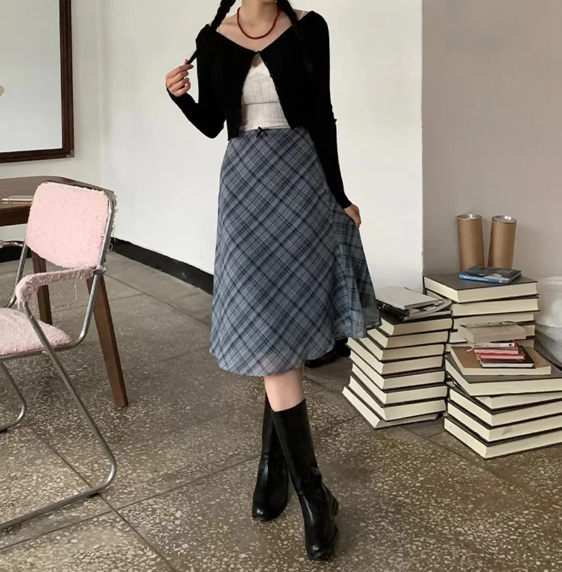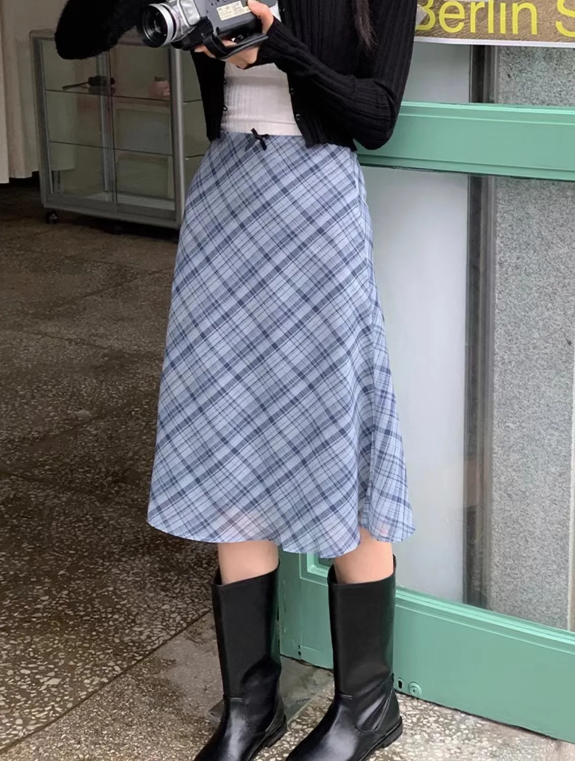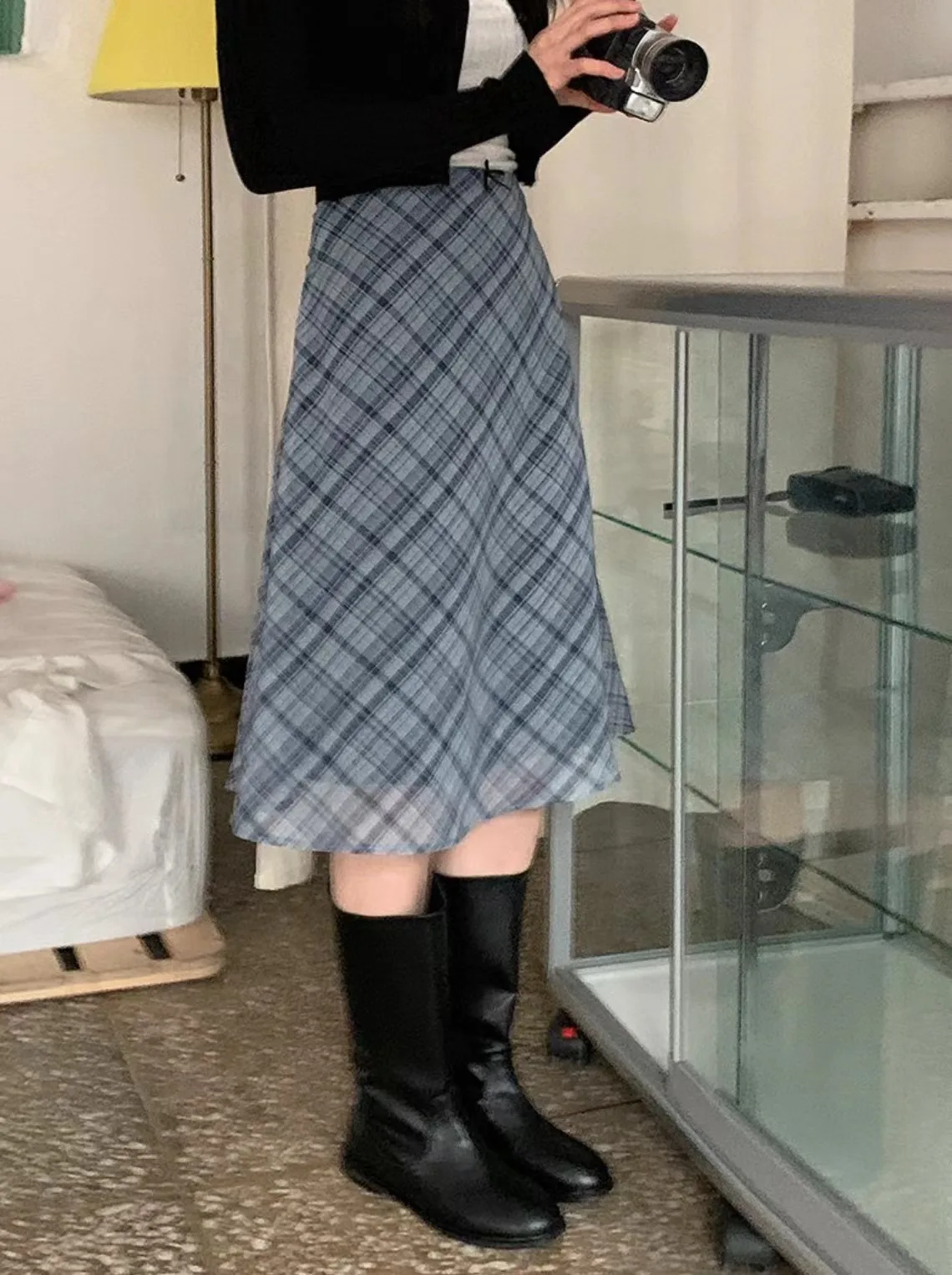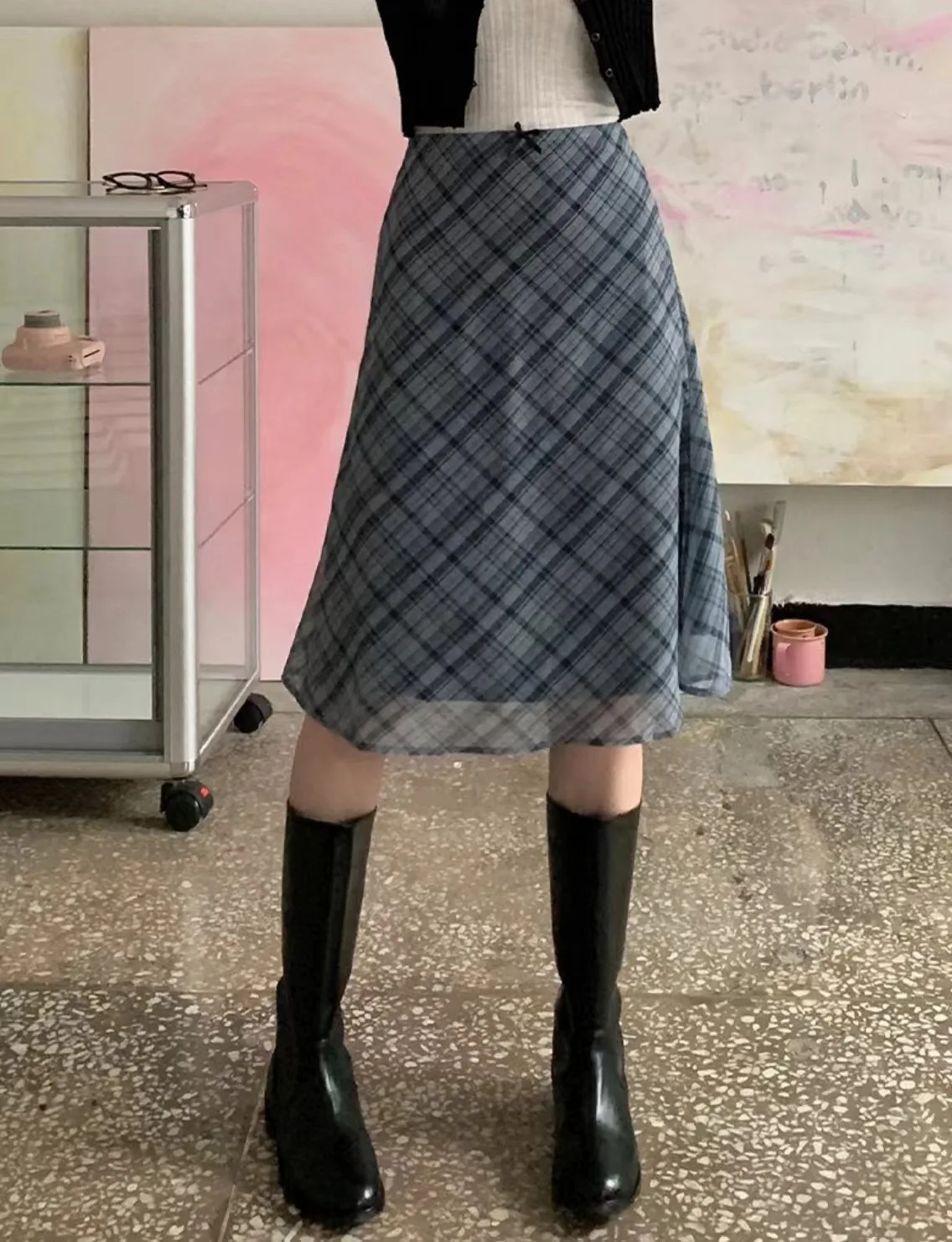 Chic Vintage Spring Summer Plaid ter Ne Dr High Waist A-Line Skirt Commute Sle Polyester Fiber 8-24 Years Old