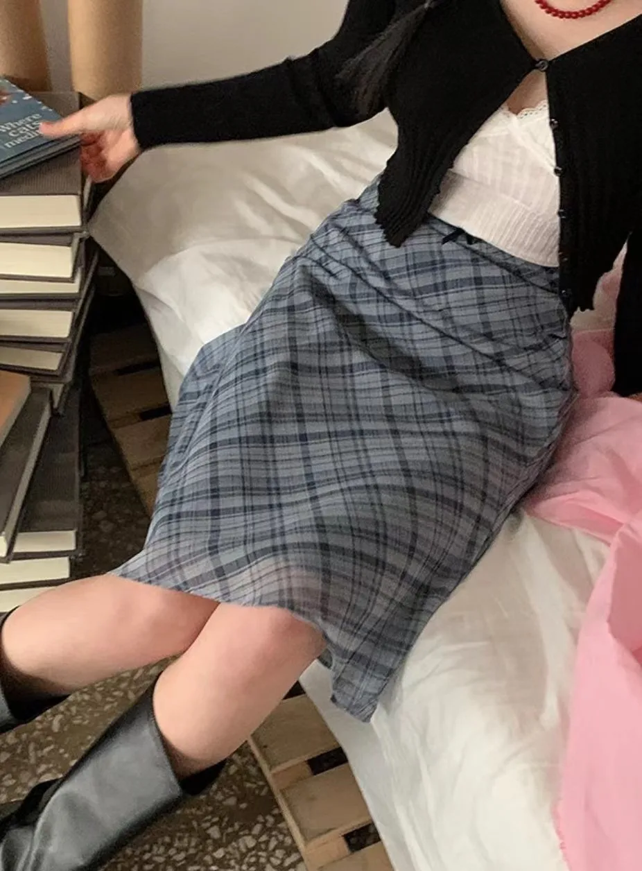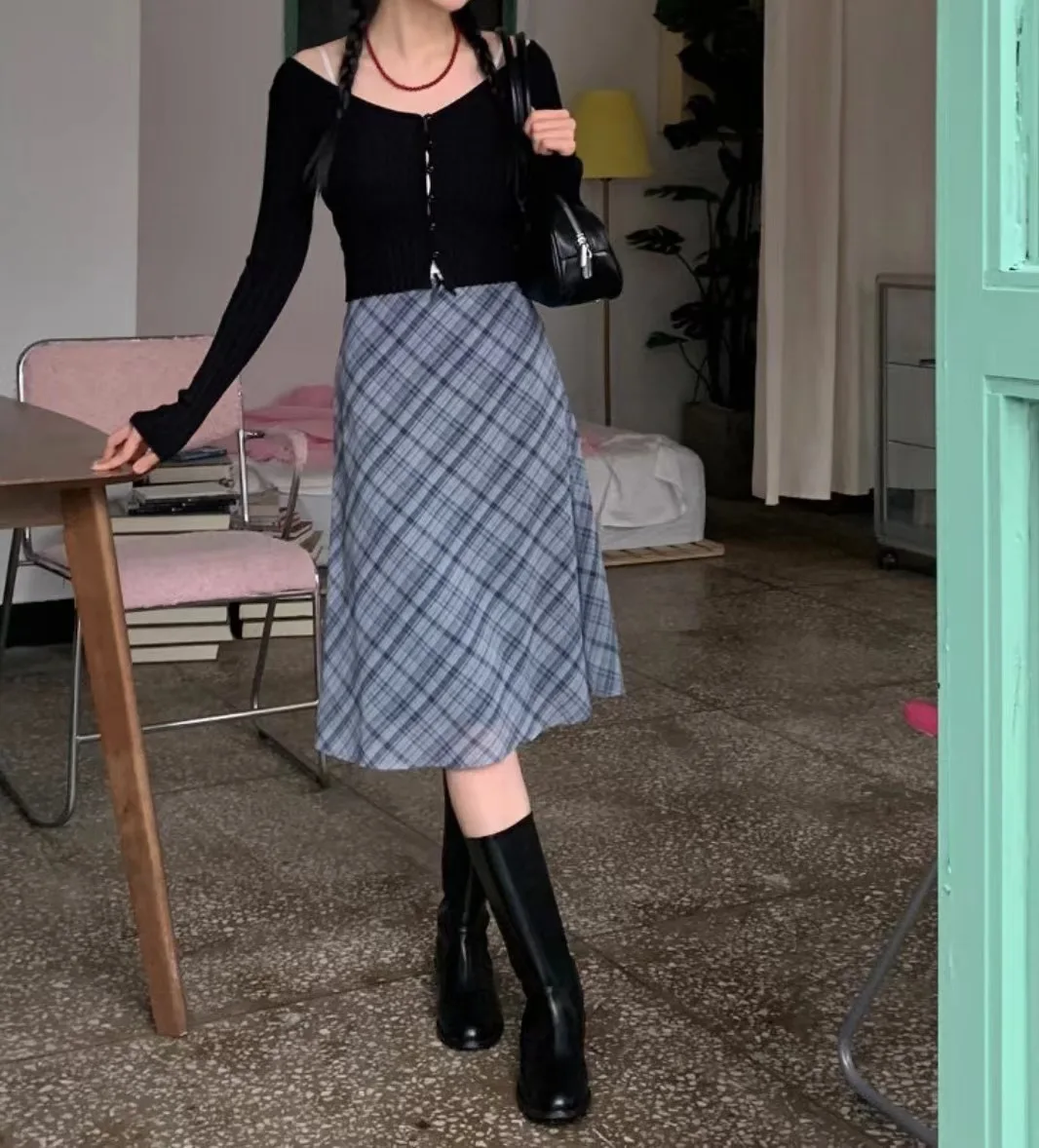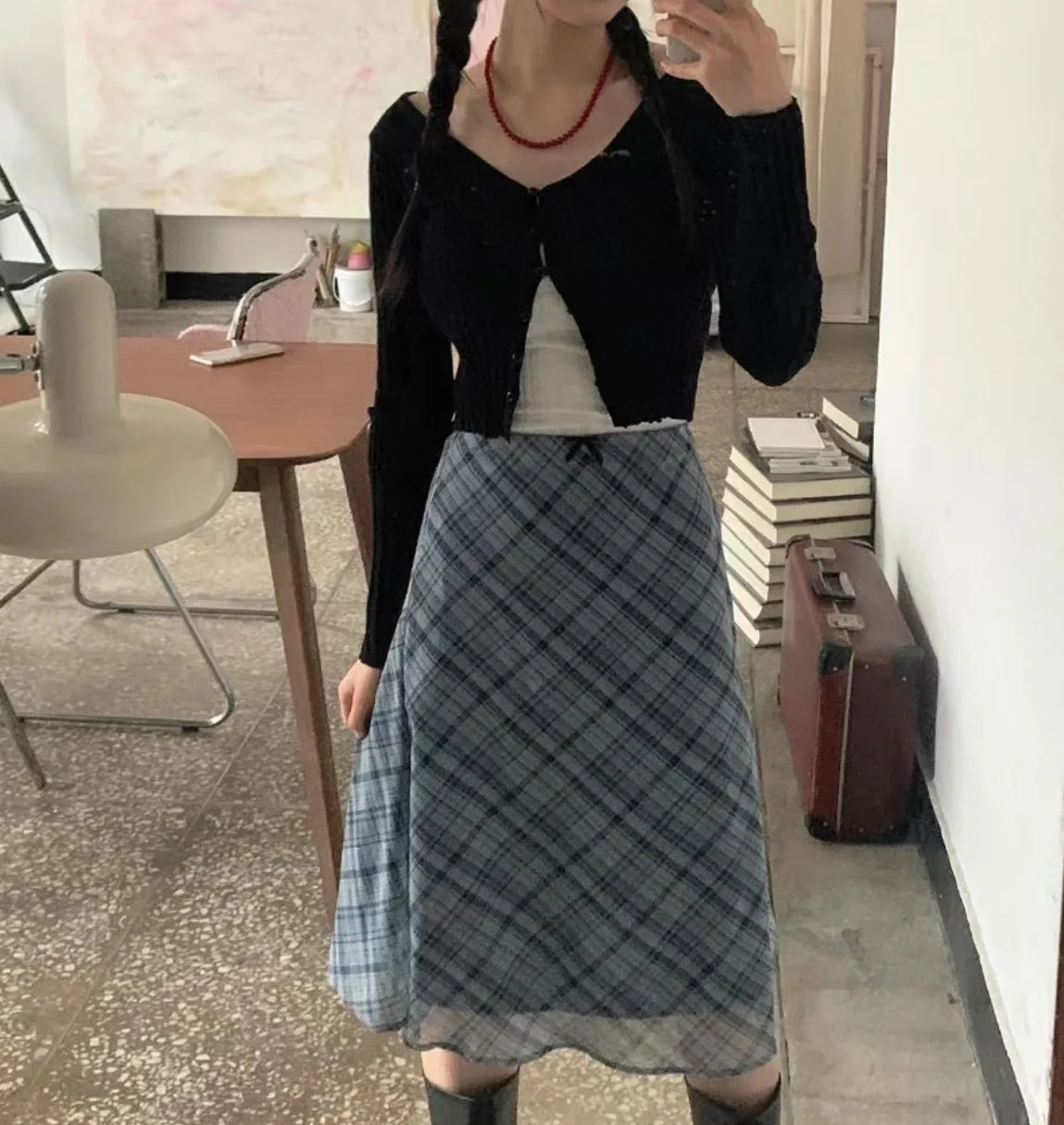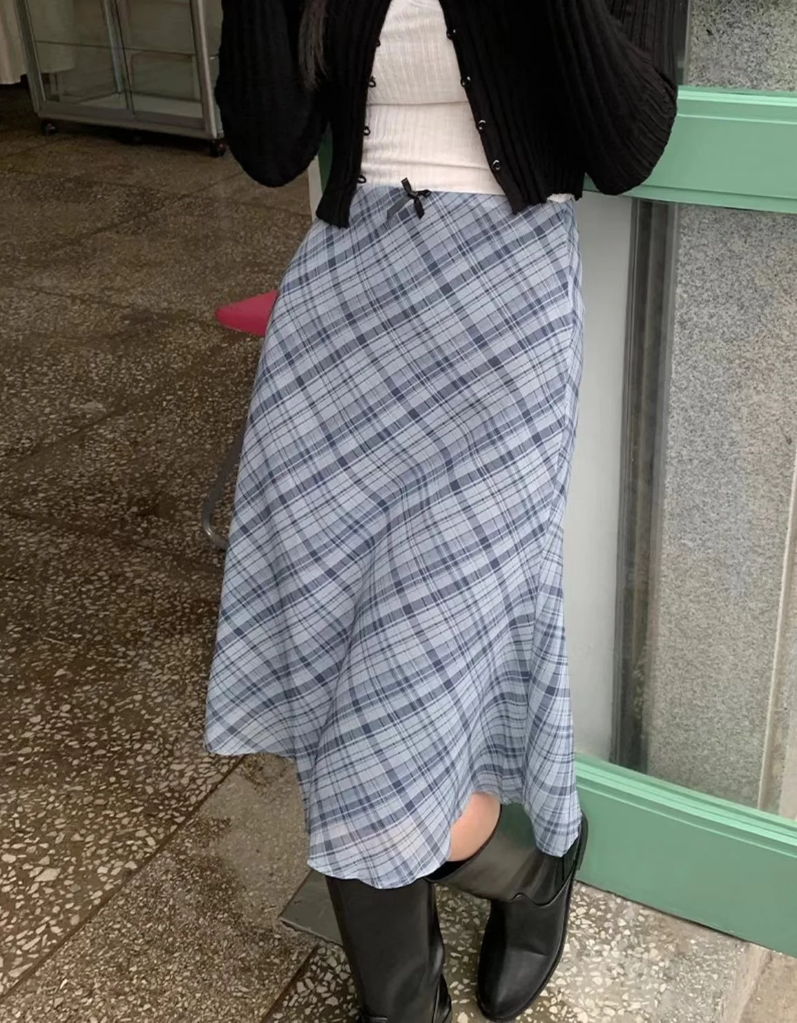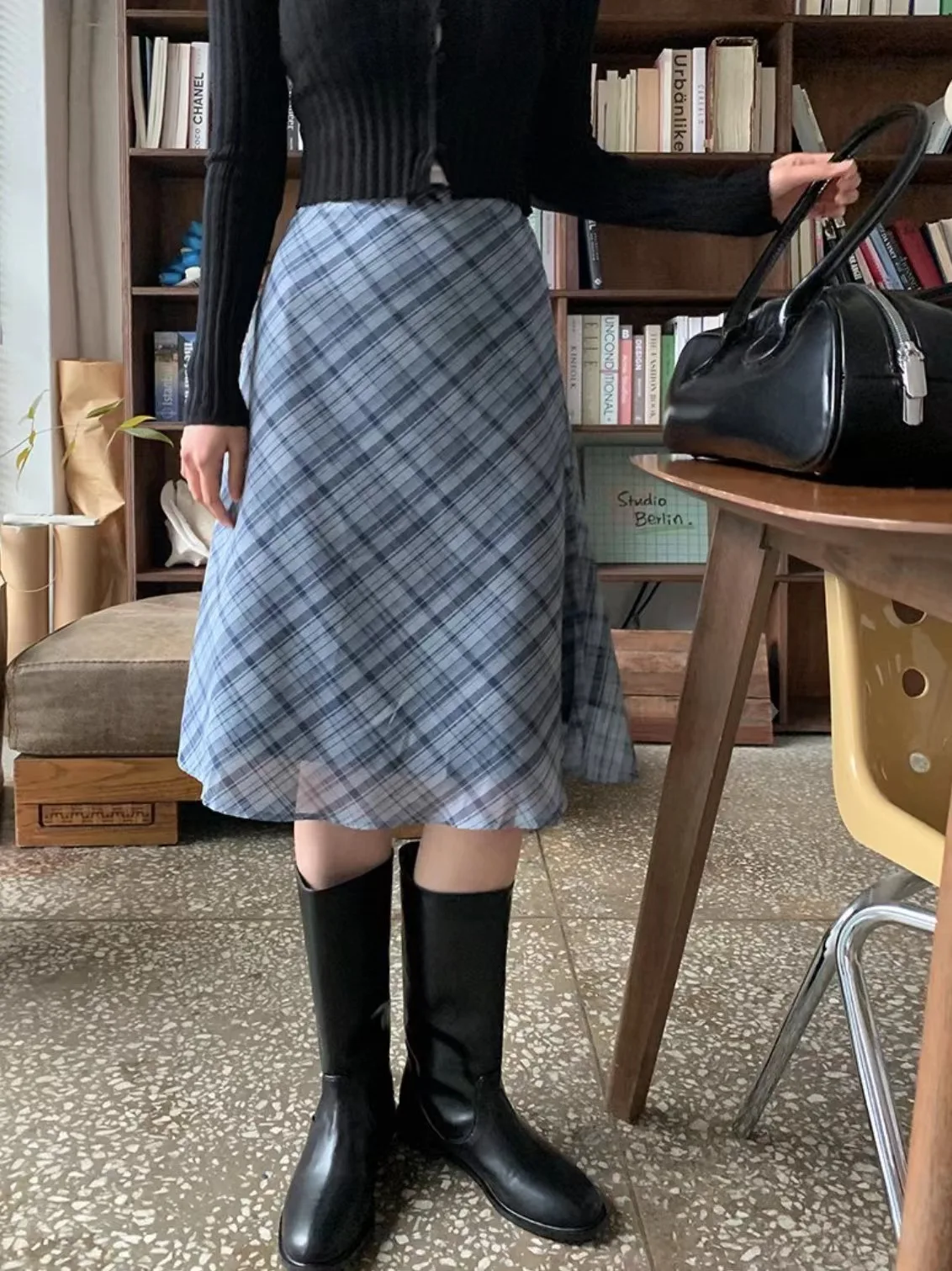 Chic Vintage Spring Summer Plaid ter Ne Dr High Waist A-Line Skirt Commute Sle Polyester Fiber 8-24 Years Old