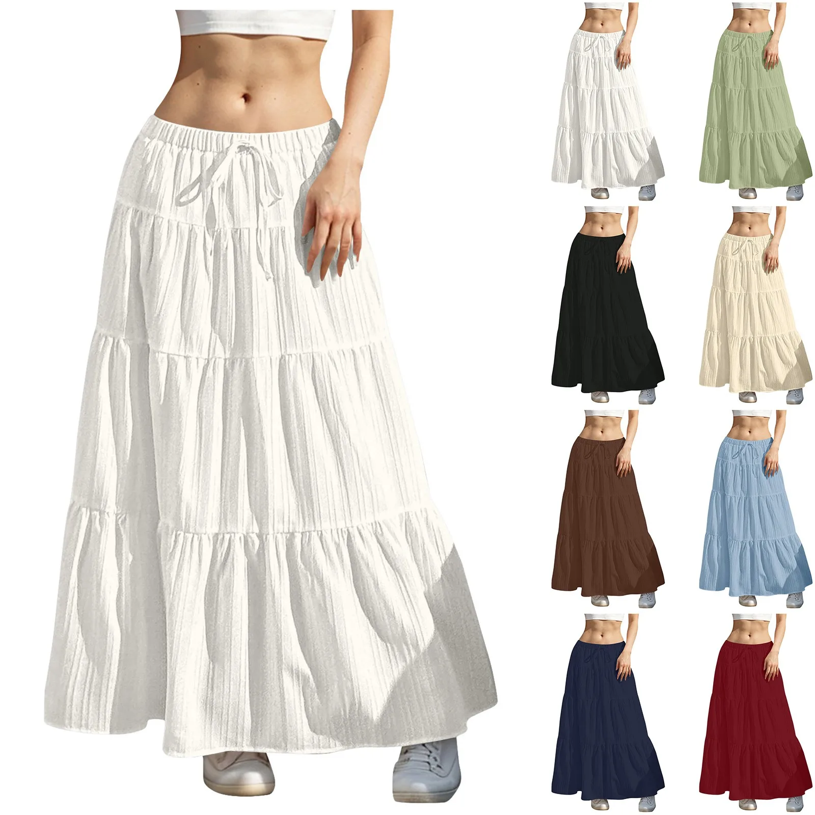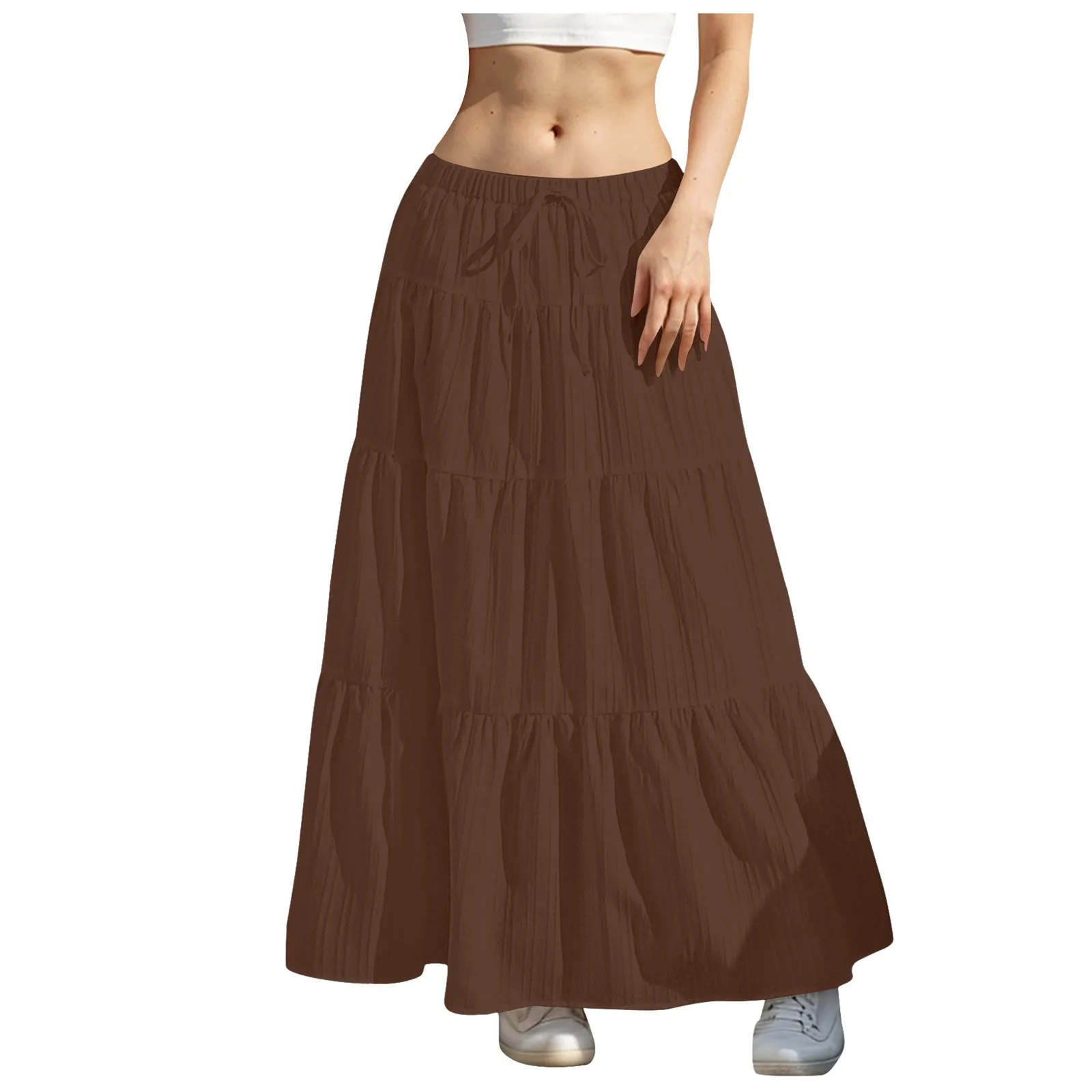 Elegant Women Flowy Skirts Flared Ruffle Boho Long Skirt Summer Beach Solid Color Swinging Layered Bowknot A Line Maxi Skirts