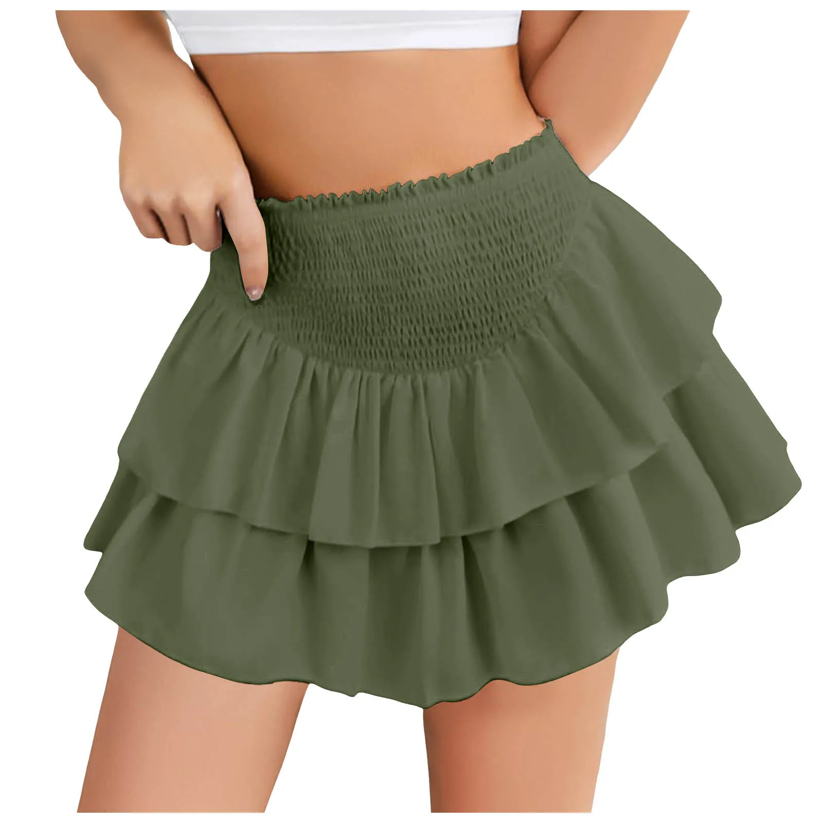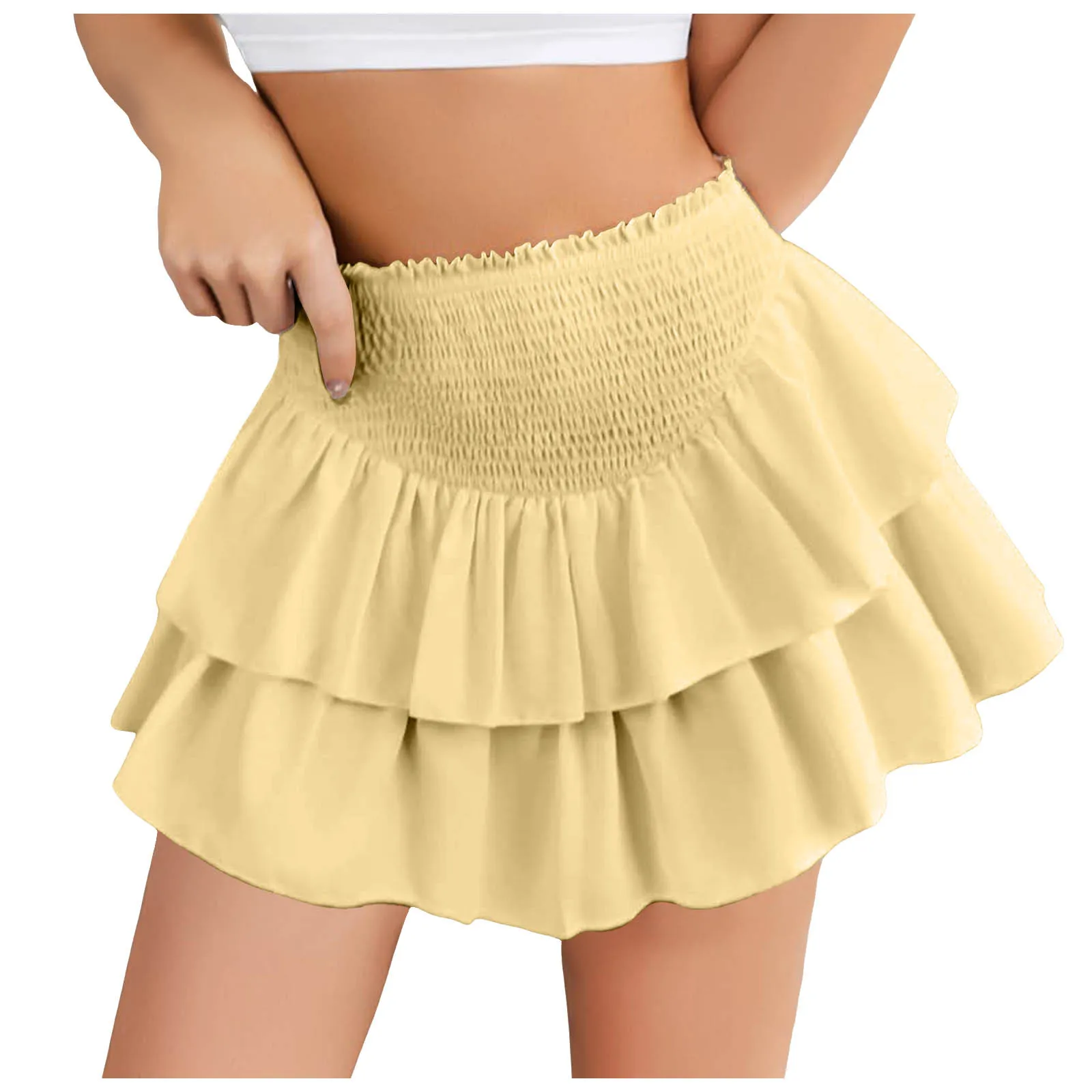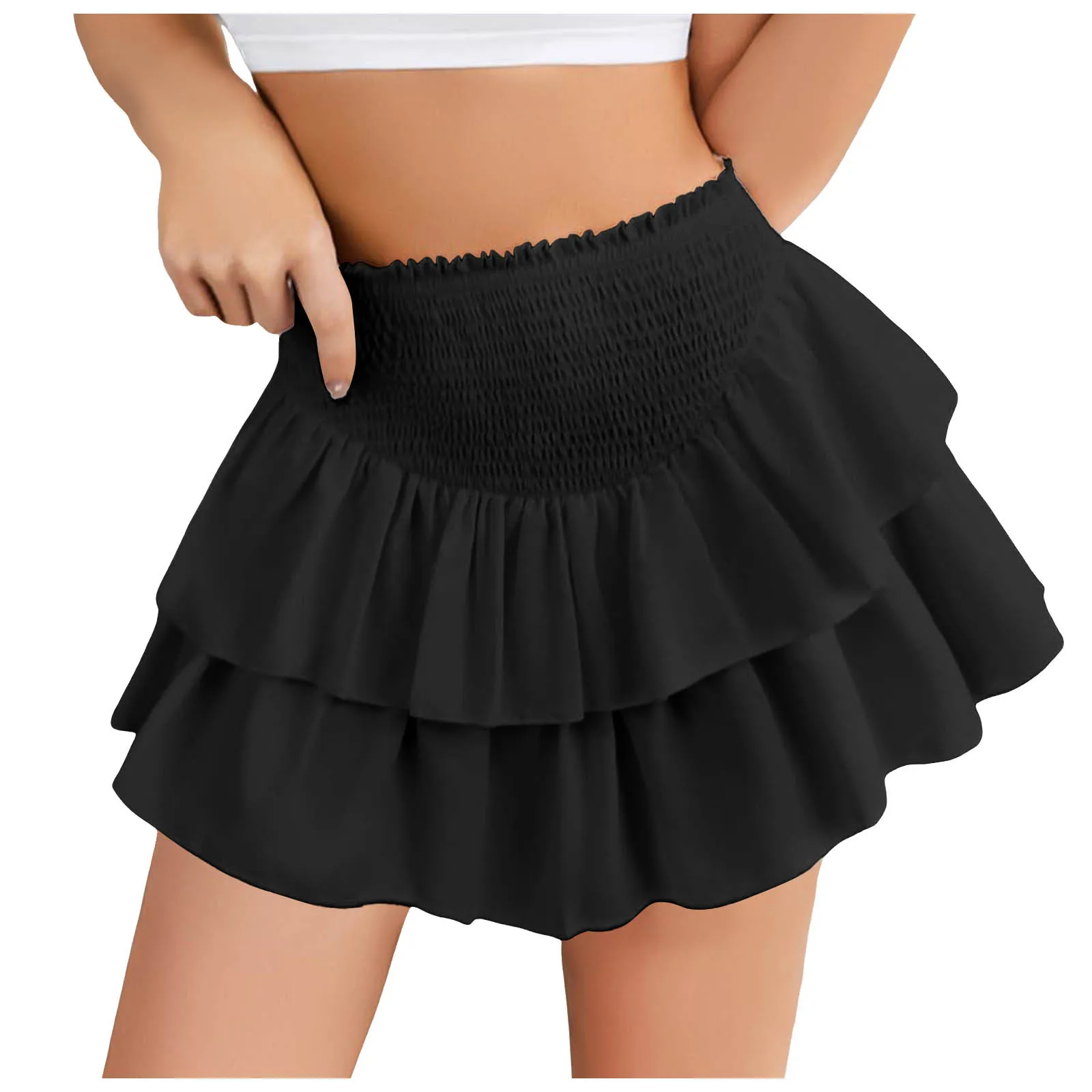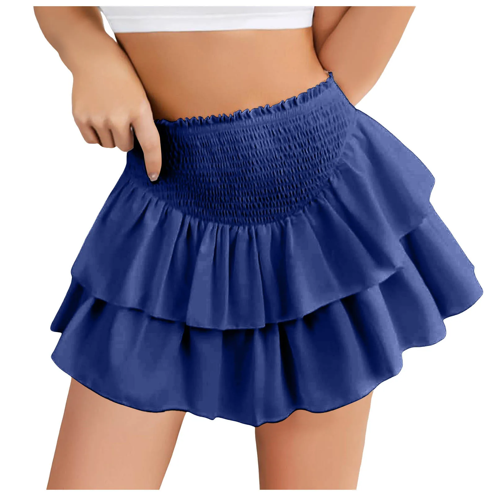 Womens High Waist Ruffle Flowy Mini Skirts Stretchy Lined Layered Pleated Casual Beach Short Skirt